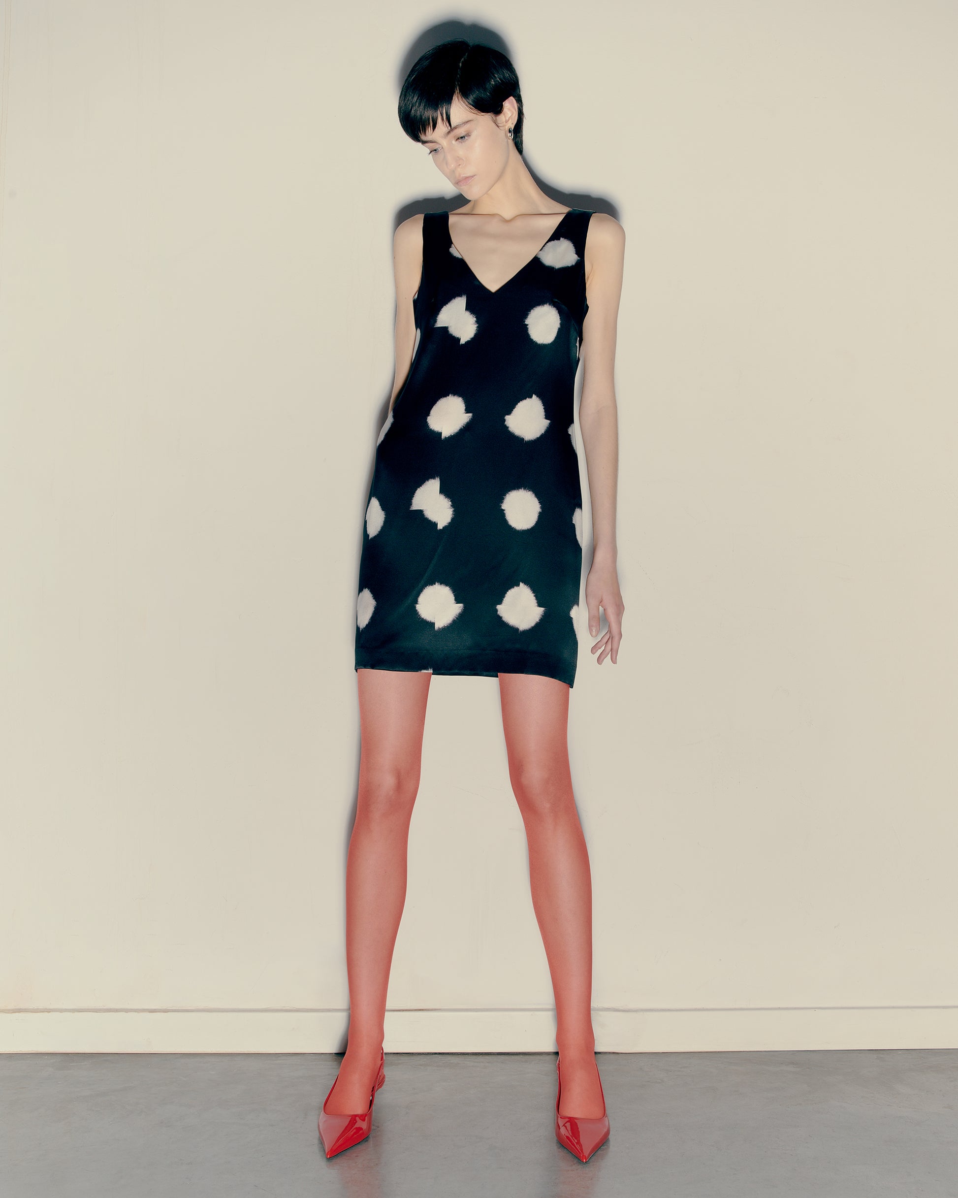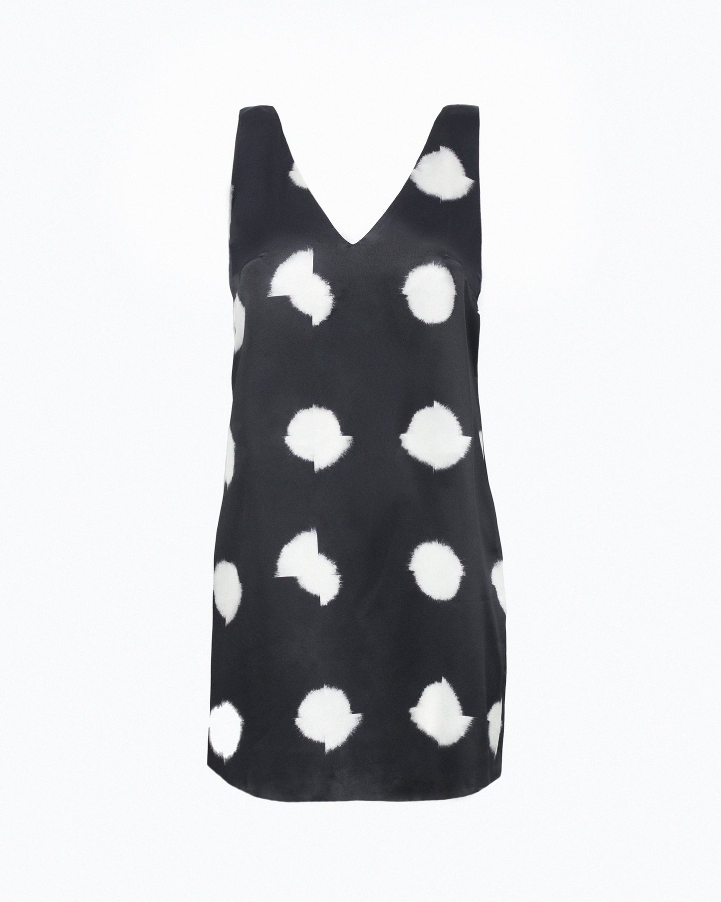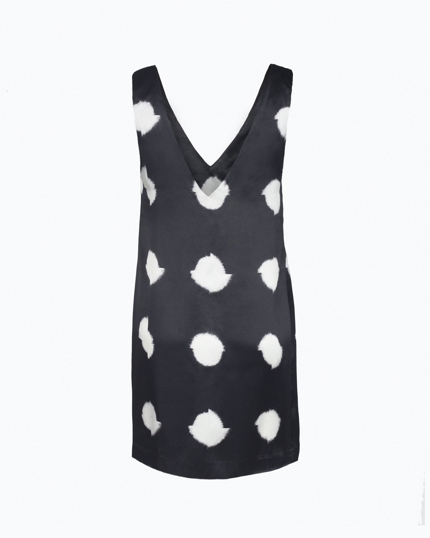 Combining comfort and elegance, this dress showcases art-inspired deconstructed dots on black print. Crafted from luxurious silk fabric, it effortlessly drapes, offering a versatile design suitable for any occasion. The short length adds a hint of flirtiness, making it a timeless wardrobe essential that beautifully embraces sophistication.