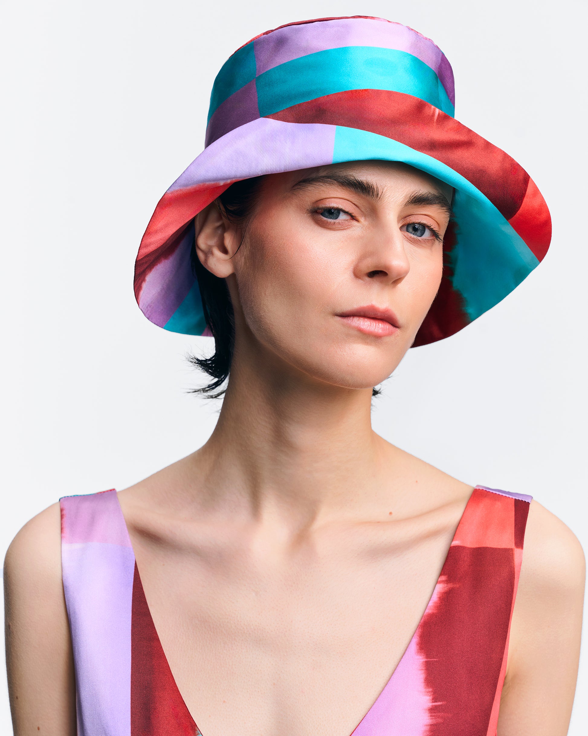 Our exquisite Hilma silk bucket hat is an indispensable summer essential. Meticulously made from top-quality, breathable silk fabric, it ensures comfort and style in equal measure. Adorned with an art-inspired print, each hat radiates a sense of cool sophistication. Named after Hilma af Klint, a celebrated Swedish artist whose abstract works served as an inspiration for its design, this hat effortlessly merges artistry with functionality. Stay protected while making a statement with our Hilma Silk Bucket Hat.