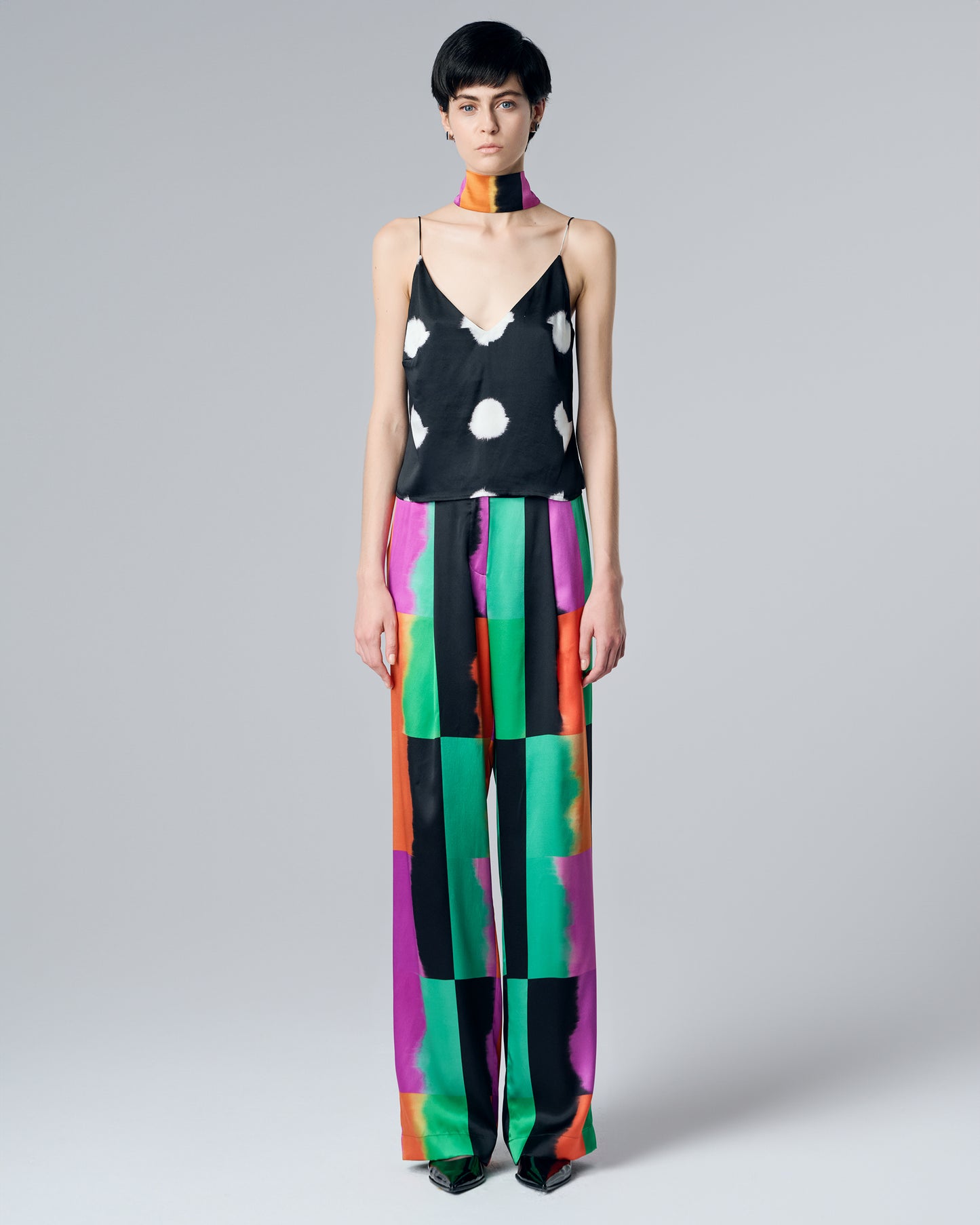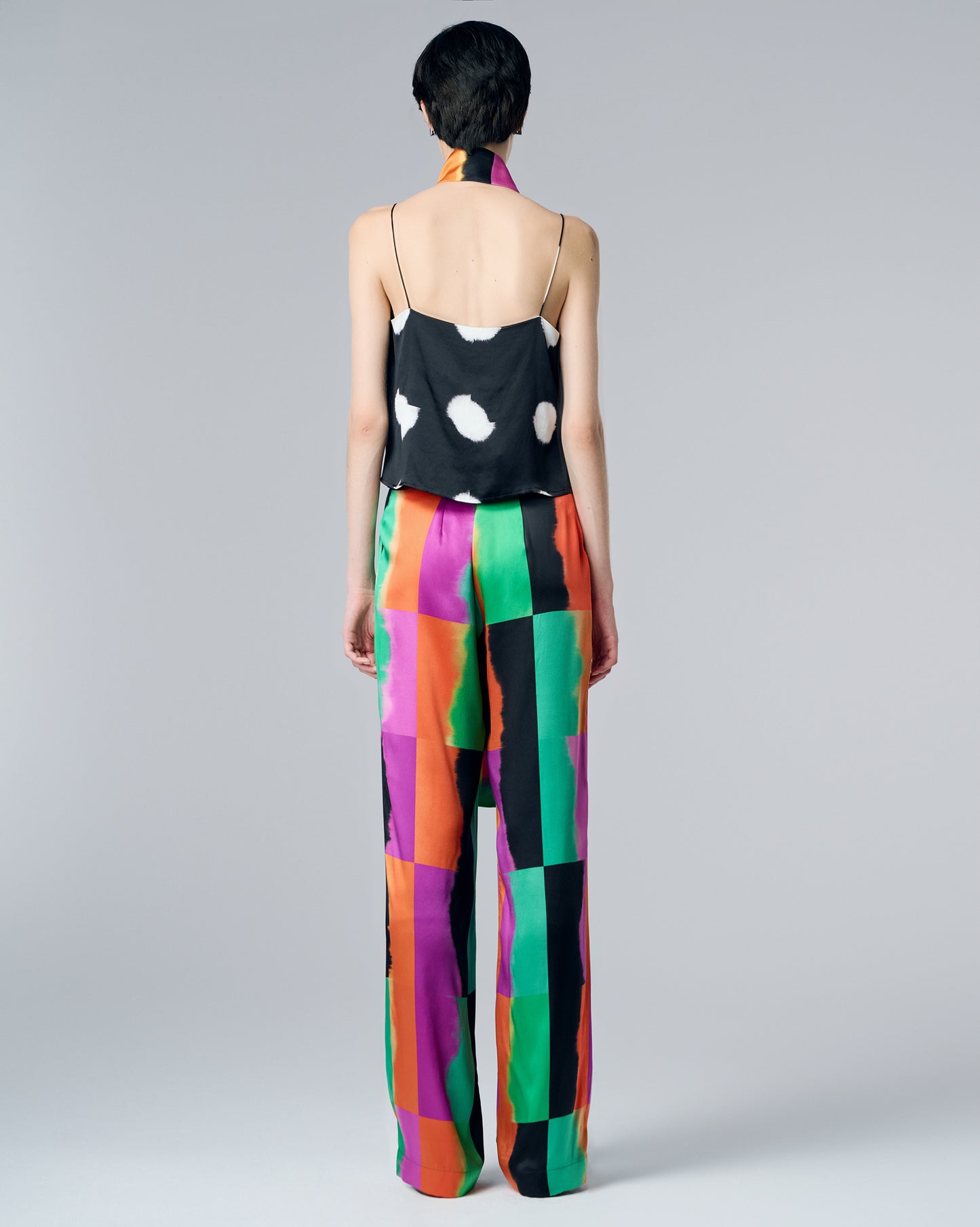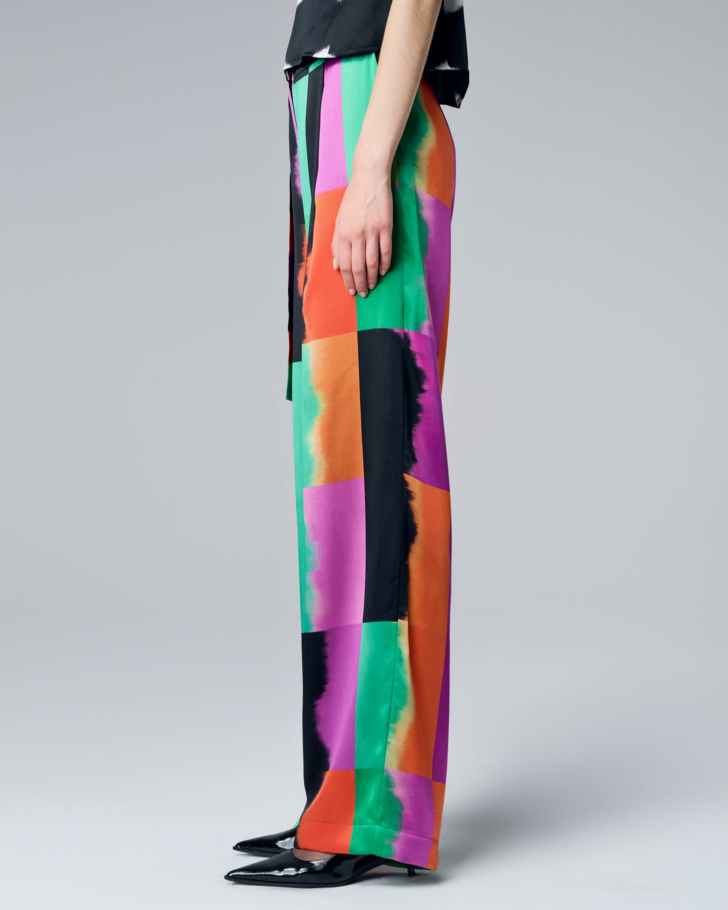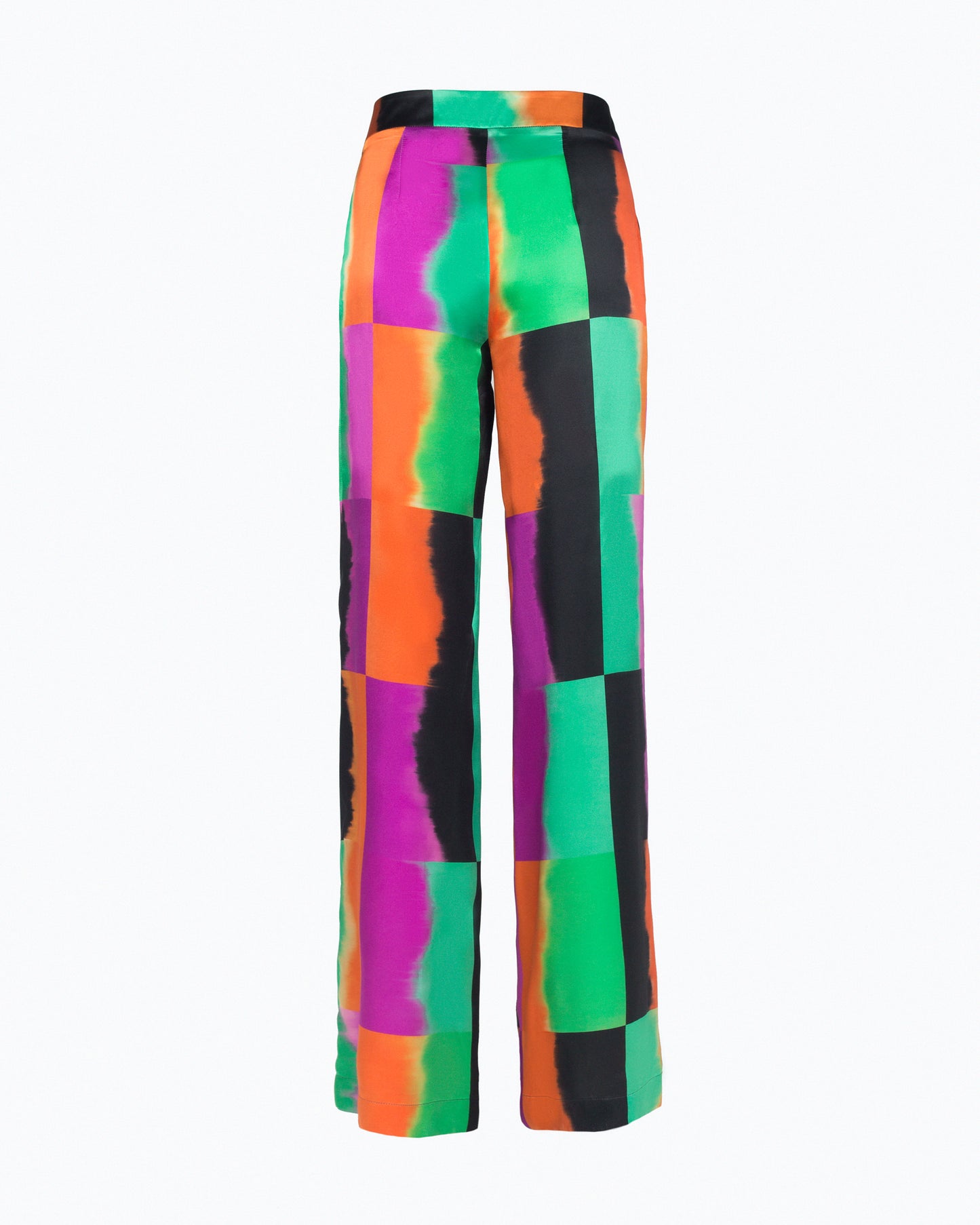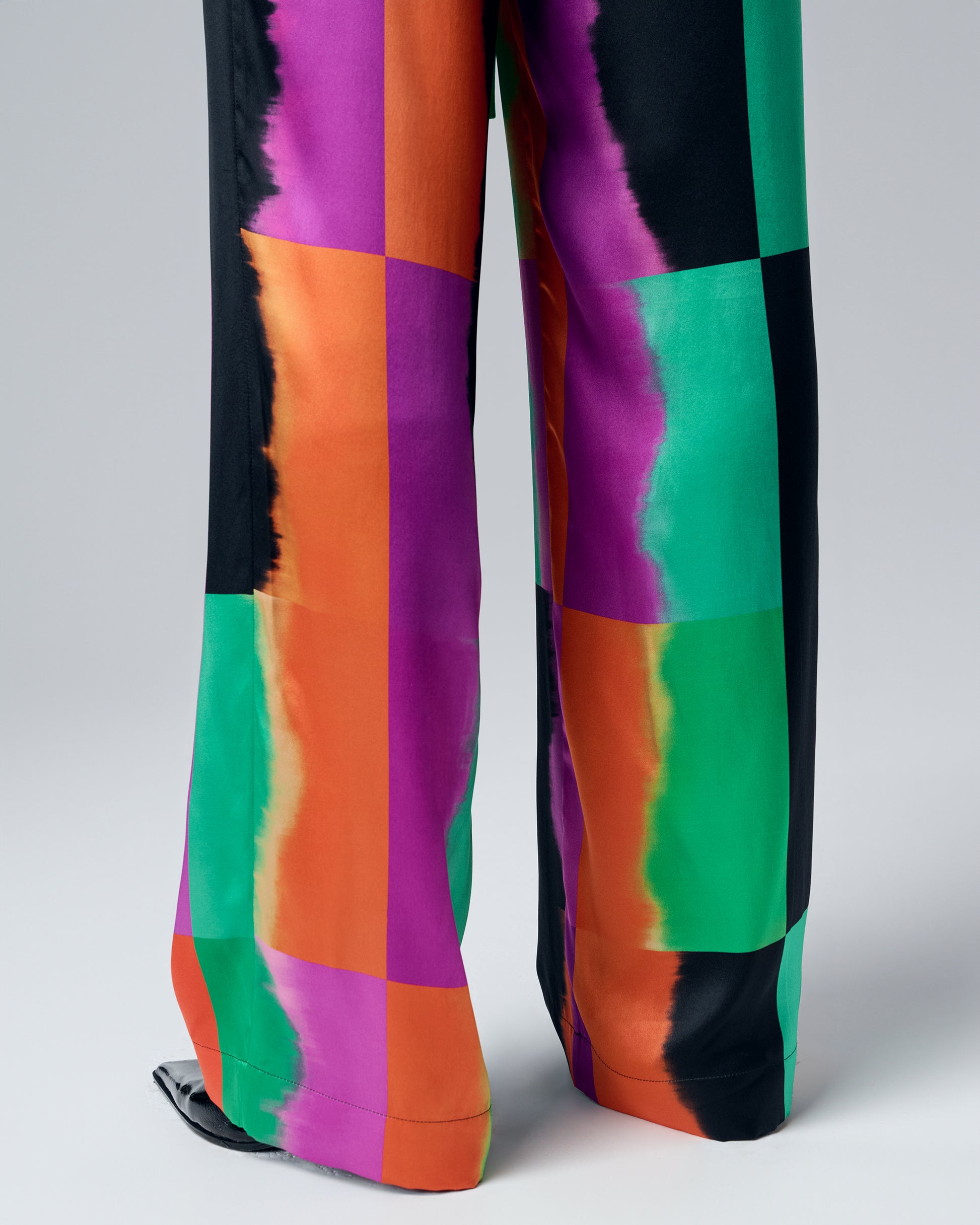 Our Illi silk pants are a harmonious blend of comfort and artistry. They contain a unique print, inspired by the captivating painting by Malgorzata Szymankiewicz featuring enlarged waves in striking orange and green hues, creating a dynamic and eye-catching pattern. Crafted from luxurious silk, these pants provide a loose, relaxed fit with a mid-rise waist and straight-cut legs, promising both style and ease with every step.