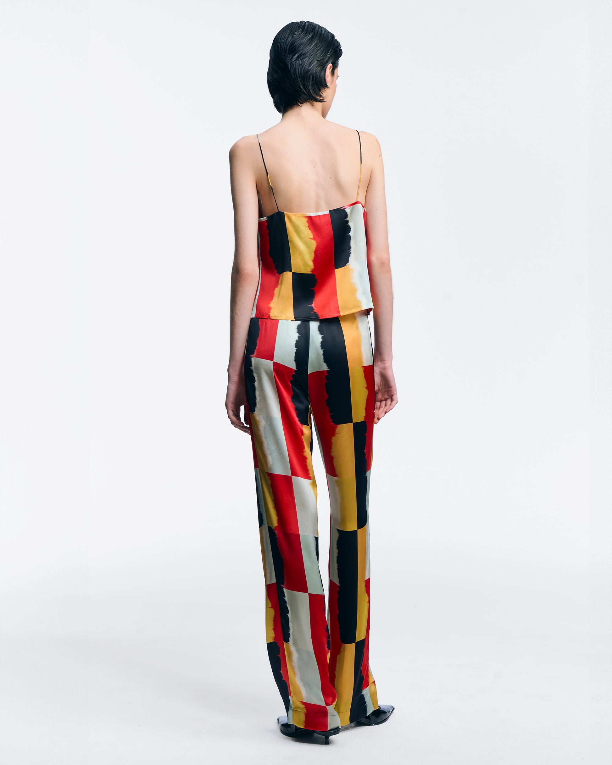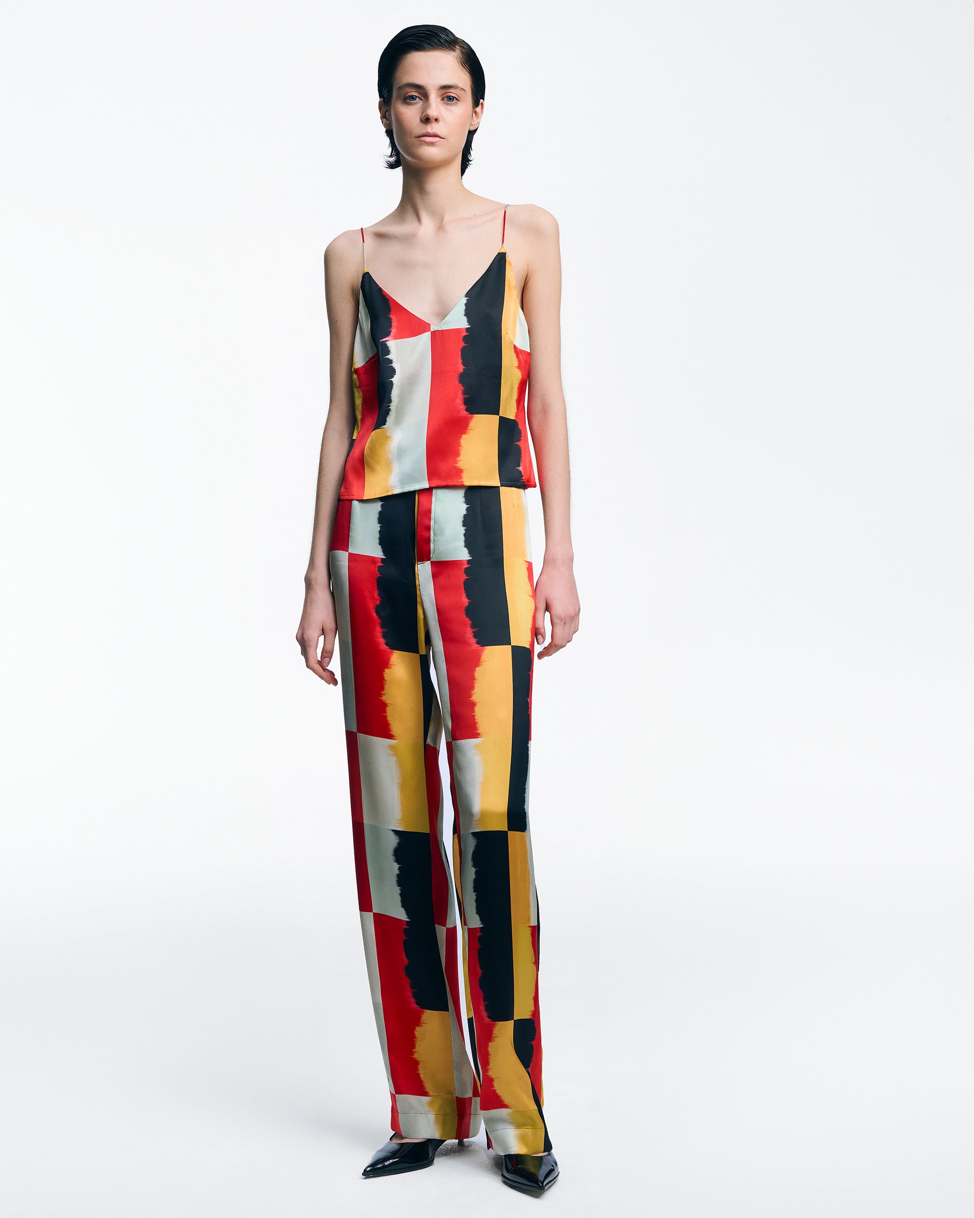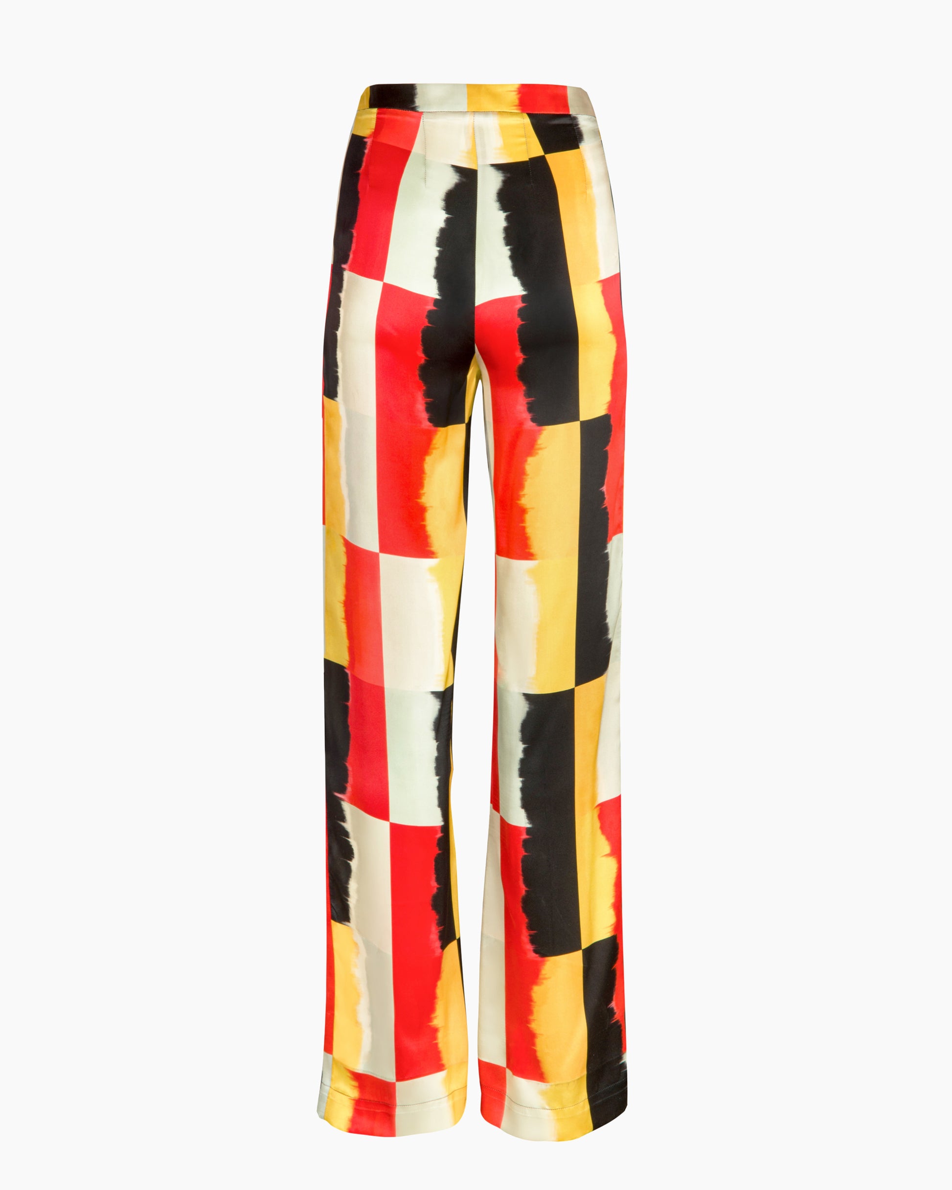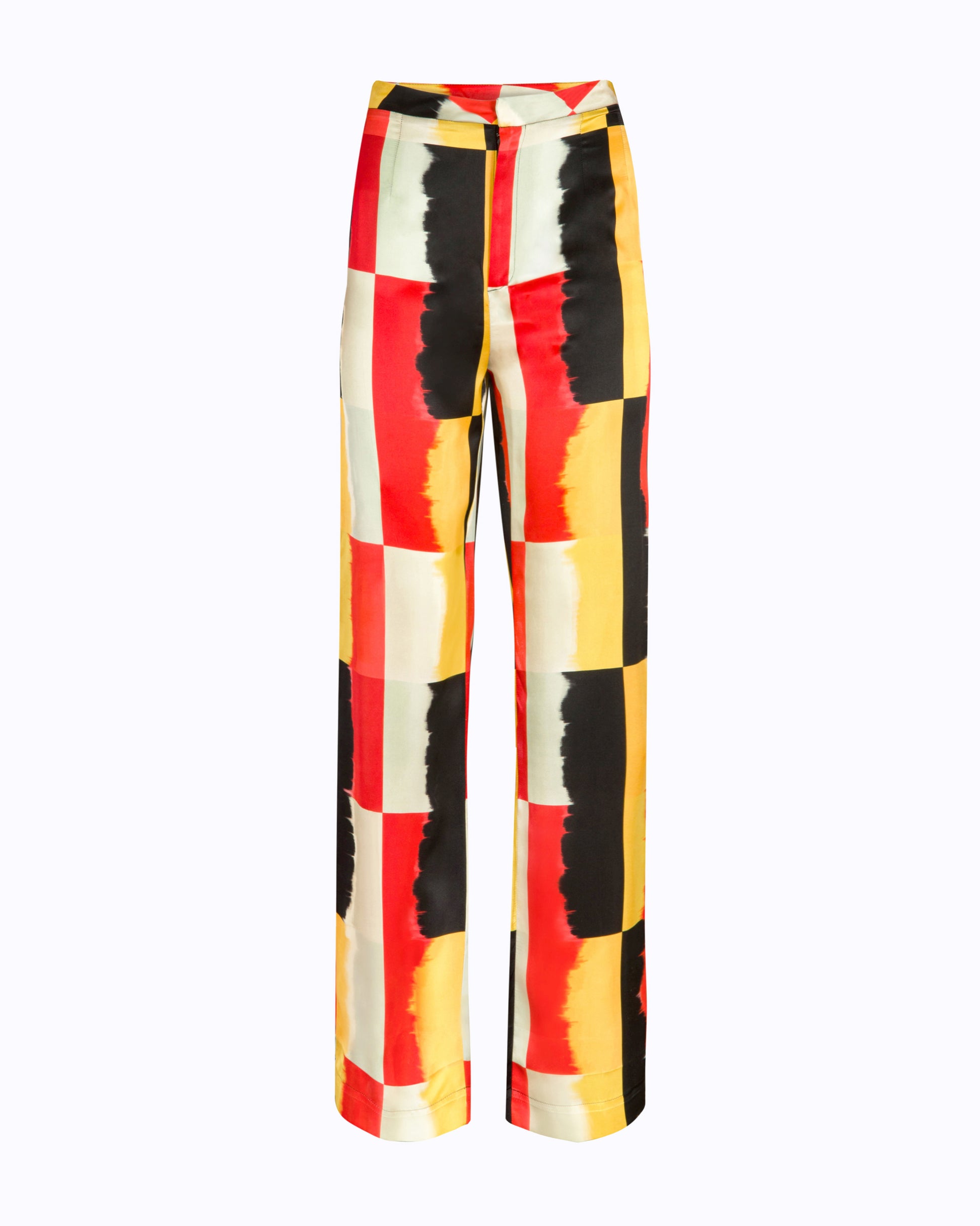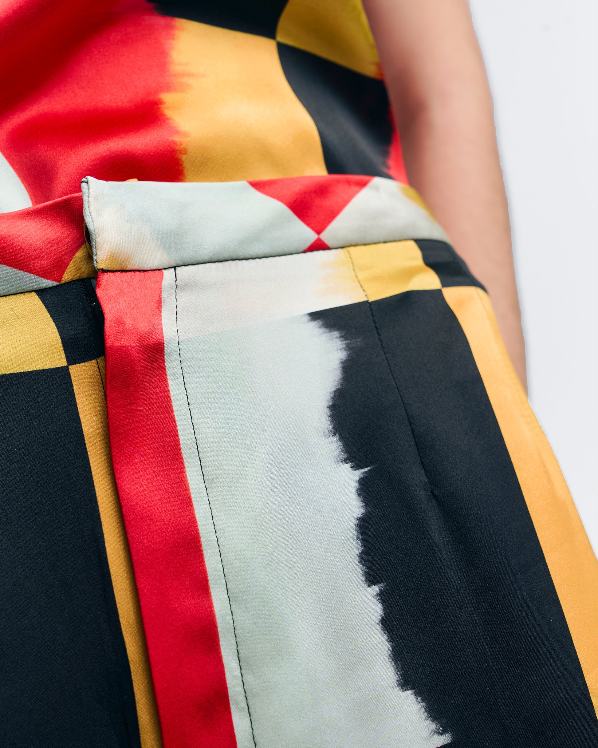 Our Lee silk pants are adorned with a unique print inspired by Malgorzata Szymankiewicz's captivating painting featuring Vertical waves in vibrant red and yellow hues, creating a dynamic and eye-catching pattern. Crafted from luxurious silk, they offer a high waist, flat front, and straight leg, promising both style and ease with every step.