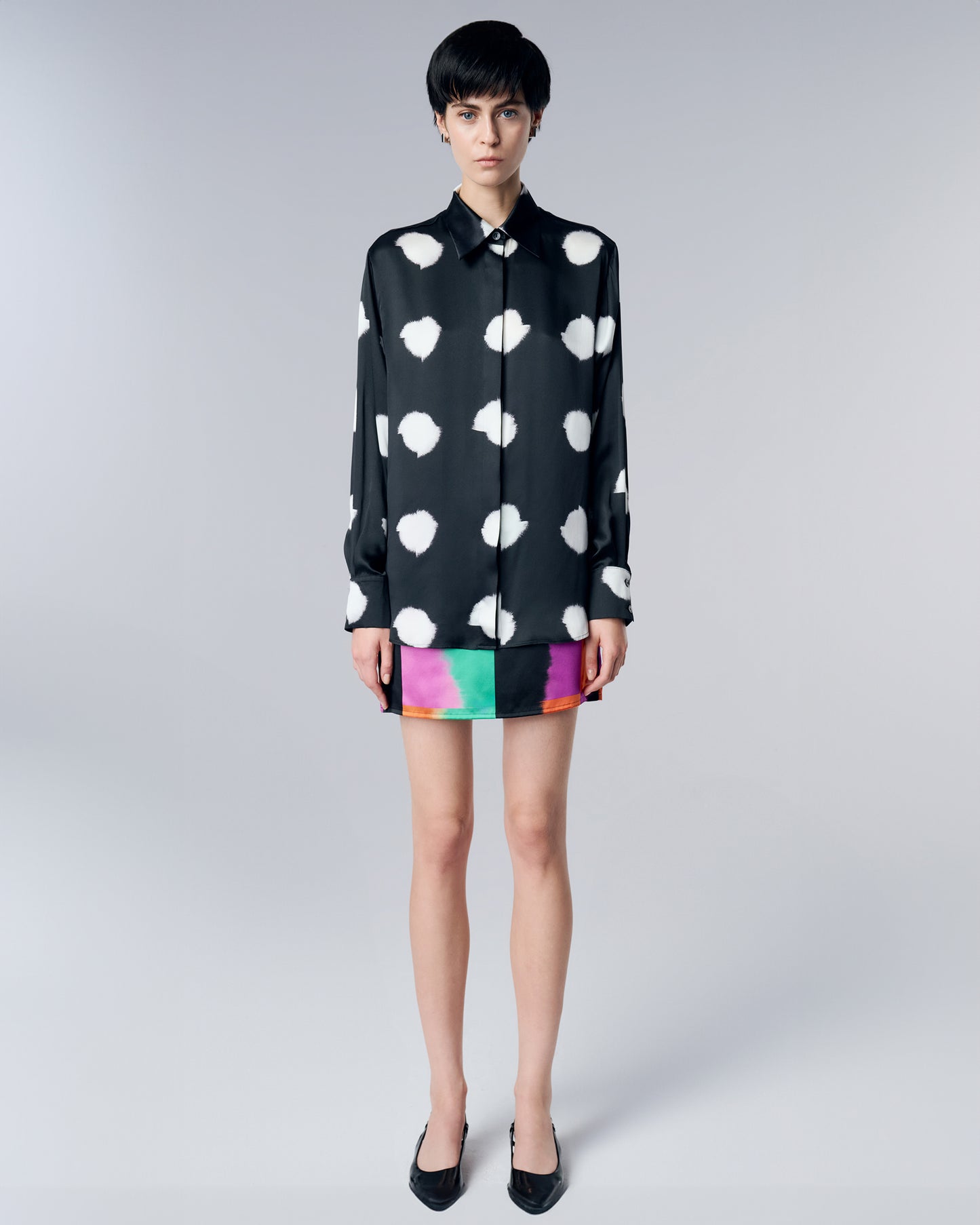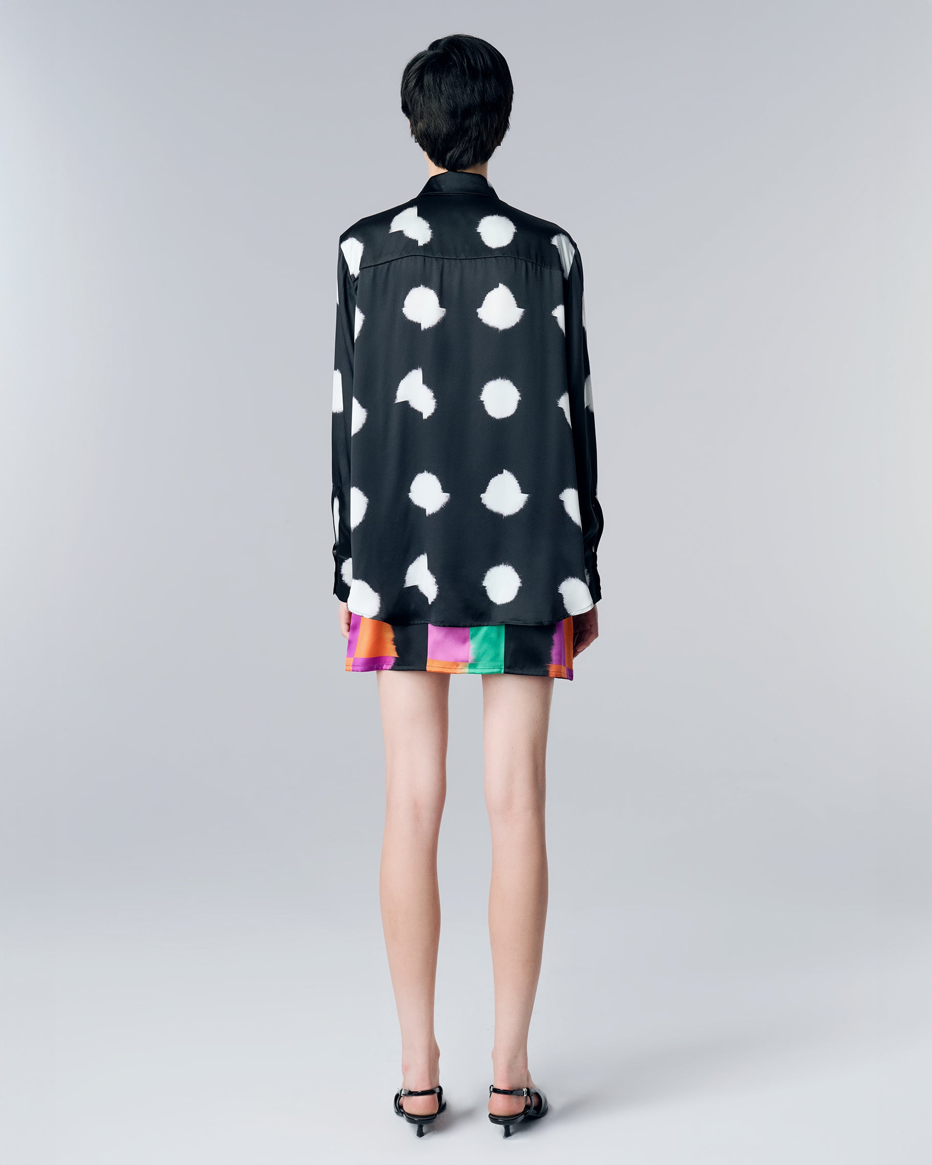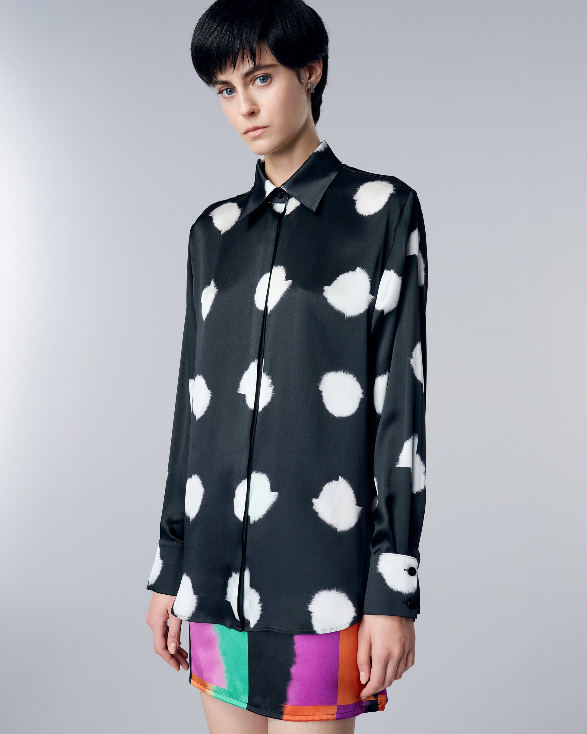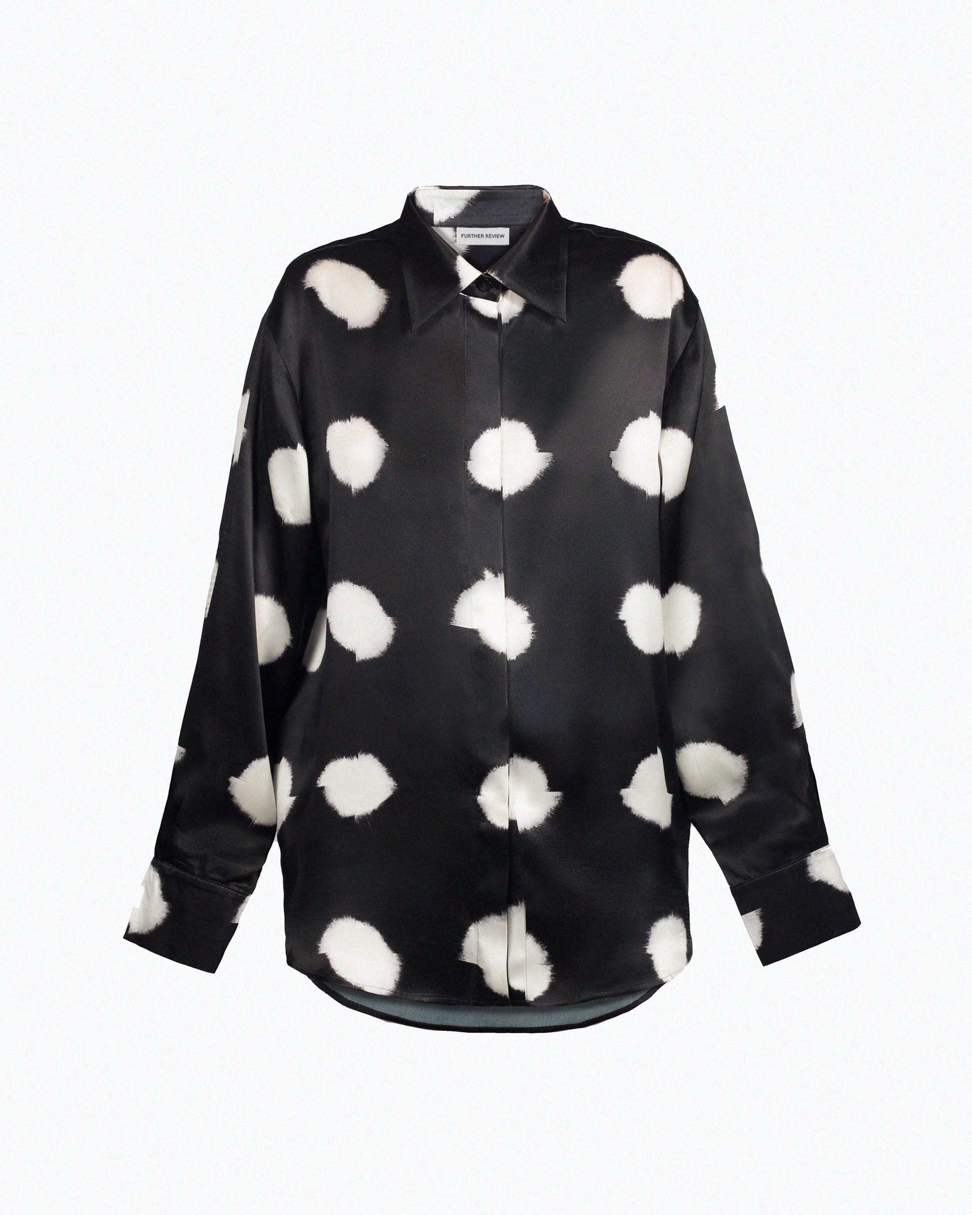 Crafted from exquisite silk, this shirt boasts a flowing silhouette and is adorned with our art-inspired Deconstructed dots on black print. The oversized fit offers a modern and relaxed look, while the smooth, breathable fabric drapes effortlessly, making it perfect for any occasion.